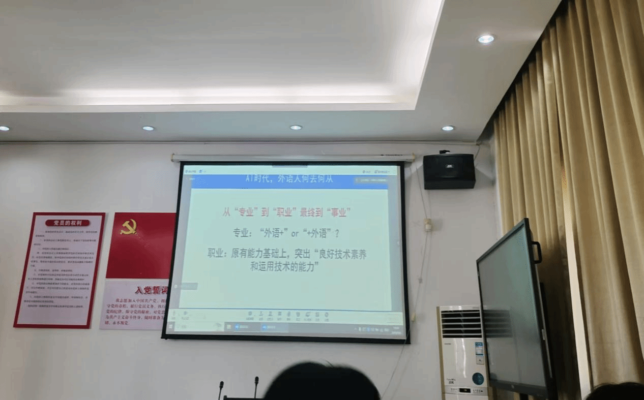 MTI教育中心副主任吴琼老师主持,外文局翻译院副院长李伟勇主讲,主题为《AI时代背景下的翻译行业发展和高端翻译人才培养》。2024级全体翻译硕士研究生、2023级全体翻译硕士研究生及2021级全体翻译专业本科生在15-102会议室参加讲座。
