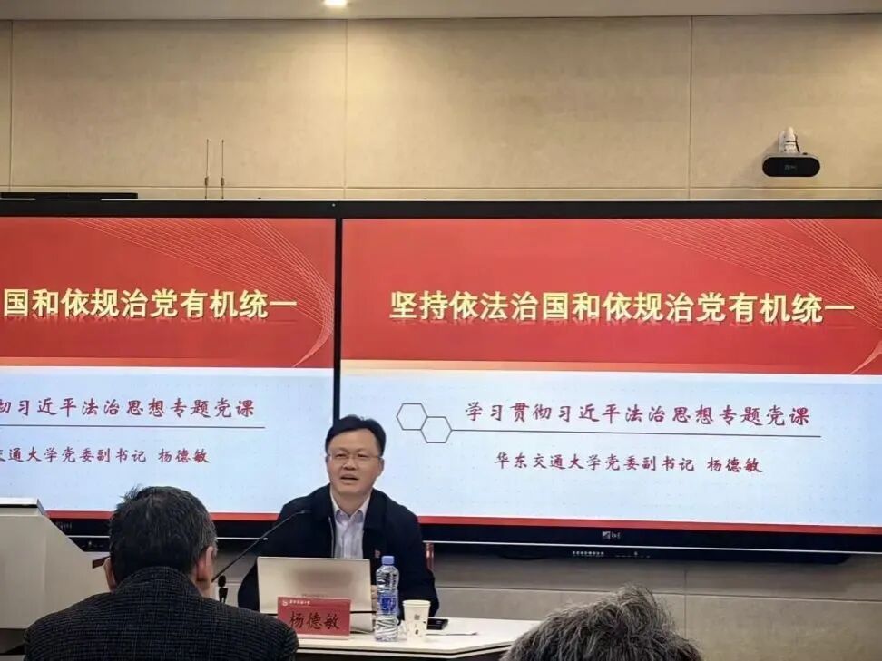 为深入推进全面从严治党、党风廉政建设,提高学校领导干部法治思维能力。12月11日下午,校党委副书记杨德敏围绕学习贯彻党的二十届四中全会精神、习近平法治思想和廉洁教育主题,上了一堂深刻且富有启发性的专题党课。