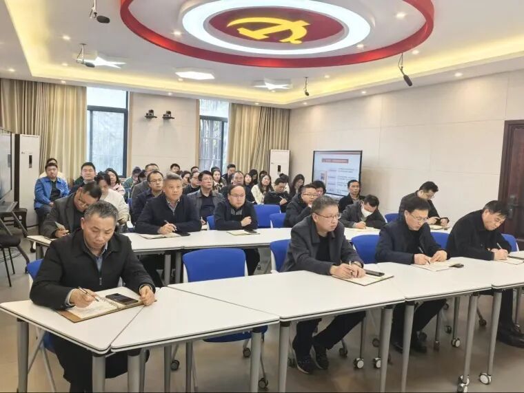 人文学院、外语学院、马克思主义学院、组织部、教工部、发规处、基建处、附属学校班子成员和教工代表,校民进委员会成员等在教36栋101会议室共同聆听了党课。