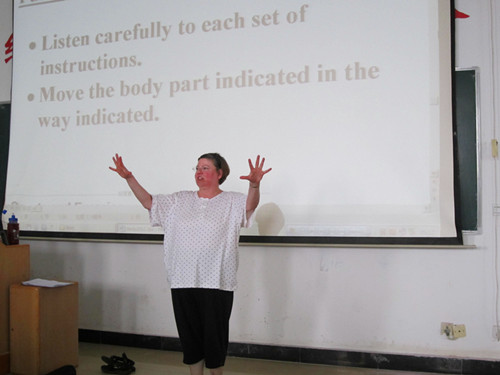 讲座现场观众们听得津津有味 本次主讲分别为外教Patty和Olga。Patty就“Body”这一主题为同学们发表了精彩演说,而Olga就“Relax——don’t worry,be happy”也发表了独特的见解。讲座吸引了大一、大二的广大英语爱好者。下午2点不到,讲座现场已是爆满。Patty以唱、听结合的方式引入主题。然后通过相关视频向大家展示了关于主题“body”的名词、动词概念,她还结合她妙趣横生的肢体语言向同学们细致地介绍了怎样用英语表示人体各部结构及人体各种动作。演讲期间,学生们积极参与相关互动,与Patty一起做各种用英语表达的肢体动作,并仔细聆听她的演讲。
