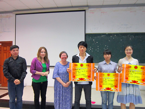 评委为获奖班级颁奖 Patty在活动的最后表示应该感谢所有参加本次比赛的同学,尤其是幕后工作人员,本次比赛非常精彩。随后,主持人在观众的掌声中宣布了获奖名单。10国贸2班夺得桂冠,10翻译1班与11级2班分别位居第二、三名。刘潇帅与黄婷分别获选最佳男主角与最佳女主角,而最佳男配角与最佳女配角则由梁佛游与彭丽群获得。 |