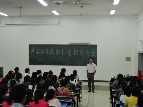 第十二届招新大会在12栋112举行。本次大会在外院学生会主席付宇舟的主持下举行,外语学院主席团、各部门部长及2012级新生到场参与本次大会。