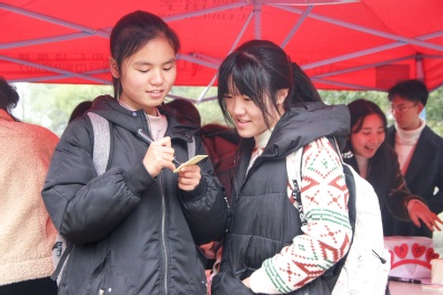 “同学,快来参加我们的答题有奖活动吧,礼品丰厚,还能帮你实现小愿望呢!”工作人员乐此不疲地宣传着。答题活动也如火如荼地进行着:从答题箱中随机抽取一张纸条,纸条上有有关女生节的五道题目,答对三道题目或以上就可以任意挑选除玫瑰花外的礼品。玫瑰花可是“重头戏”,需要转发女生节说说,集赞66个才能领取。外语学院18英语国贸一班的曹静奔着摊位一路小跑而来。“知道今天是女生节,所以昨天特意转发说说,好不容易集满赞了,当然要尽快兑换了。”她笑着说。