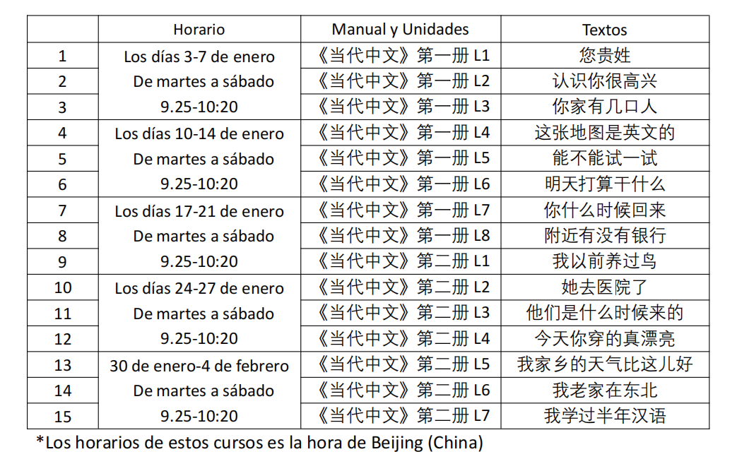*Los horarios de estos cursos es la hora de Beijing (China)