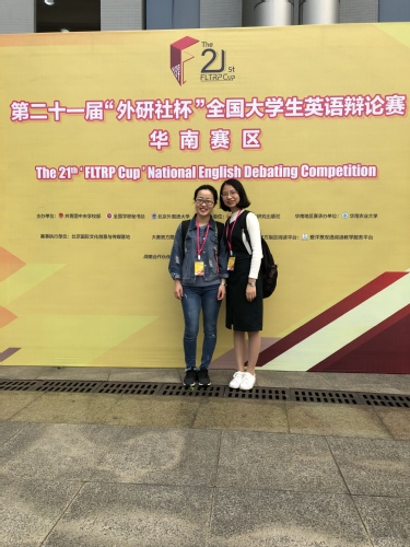 黄珊老师指导的刘嘉玉(14级英语国贸)和童宁(14级英语国贸),在第二十一届“外研社杯”全国英语辩论赛华南赛区98支队伍中突围,荣获二等奖,并晋级全国总决赛。同时,黄珊老师也连续三年获得该赛事“优秀评委”称号。