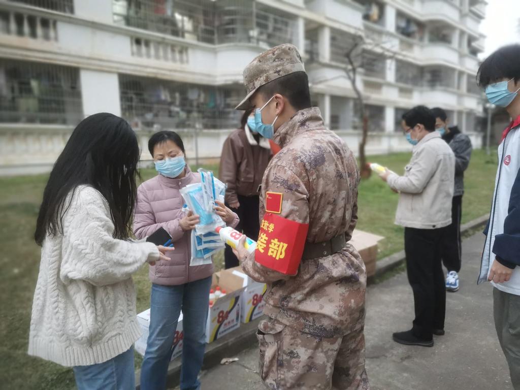 副院长单伟红受院党委和院行政的委托,率领在校教师党员谭涛、刘春莲、龚沁怡和学生党员谢潇等争当“火车头”做表率,一同深入学生宿舍发放防疫物资。他们将防疫物资仔细清点、消毒,第一时间送到了学生宿舍楼下。每一位老师和志愿者也将自身认真仔细消毒,以此减少病毒传播风险,保障每一位同学的绝对安全。