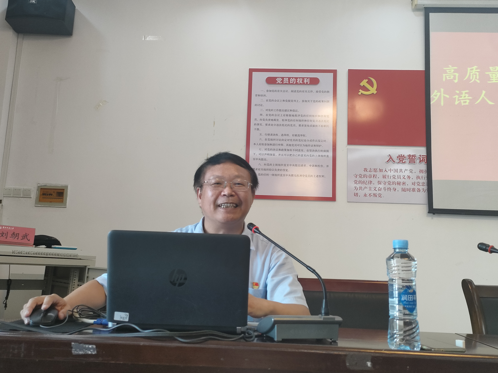 学科带头人袁平华教授,“外教社杯”全国高校外语教学大赛一等奖获得者龚沁怡老师做分享报告,全院教职工参会。