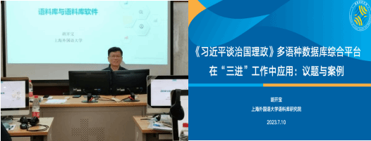 11日上午,国家重大人才计划特聘教授、上海外国语大学语料库研究院院长、博士生导师胡开宝教授为大家全面介绍了语料库创建流程、语料库工具和语料库研究前沿,并以《习近平谈治国理政》多语种数据库综合平台在“三进”工作中的应用为例,为学员展示如何使用语料库进行外语教学与研究。他强调应在教学与科研工作中拓宽视野、科技创新,有机地融入课程思政。