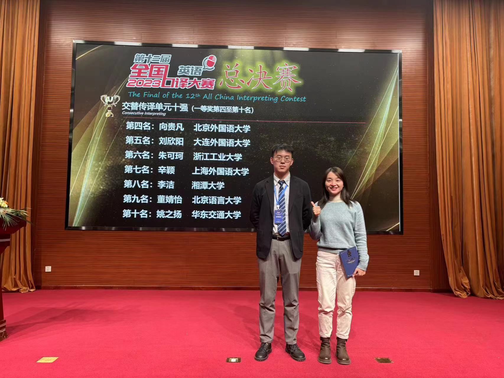 2021级翻译硕士姚之扬在总决赛交替传译单元进入全国十强,荣获一等奖,彭翠老师被评为优秀指导老师。这是本届比赛中江西省高校取得的最好成绩,也是有史以来全省高校在该赛事所取得的最好成绩。