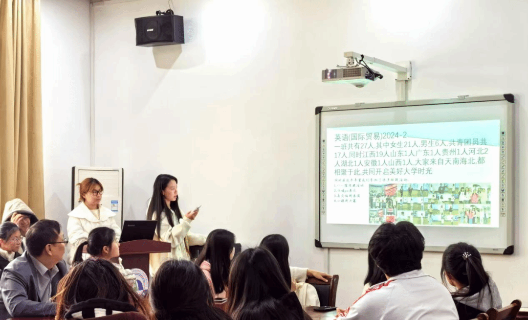 首先,门晓梅和刘雯婕分别从各班班级人员构成、班级建设成果及班级风貌出发,详细地为大家汇报了2024级英语(国际贸易)两个班近3个月来班级表现。从军训到开学典礼,从运动会到心理剧大赛,从迎新晚会到英语话剧表演,无不彰显着独属于2024级英语(国际贸易)的青春与热情、活力与激情。