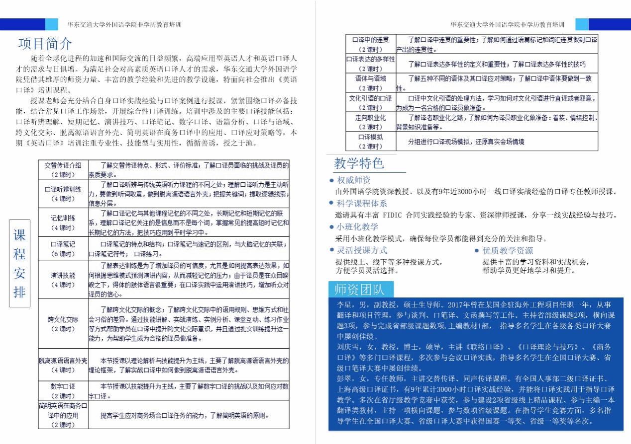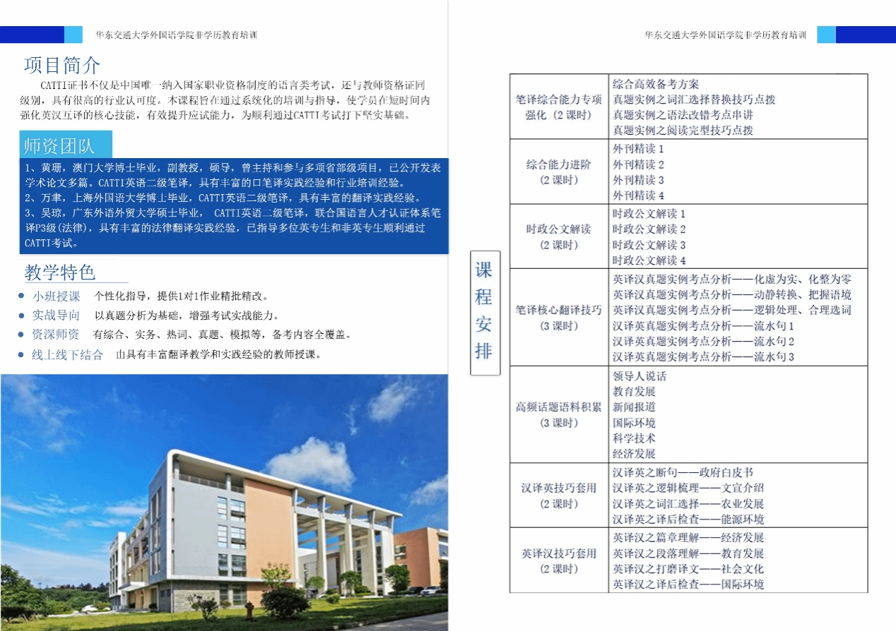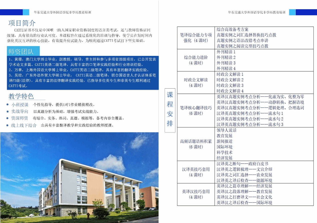 随着全球化进程的加速和国际交流的日益频繁,出国留学人员、高端应用型英语人才及英语口笔译人才的需求与日俱增。为满足社会对高素质英语人才的需求,正妹AV 凭借其雄厚的师资力量、丰富的教学经验和先进的教学设施,特面向社会推出《雅思双阶全能冲刺班》、《CATTI二级笔译》、《CATTI三级笔译》及《英语口译》等培训课程。各课程项目简介、课程安排、教学特色及师资团队等详细信息见下图。